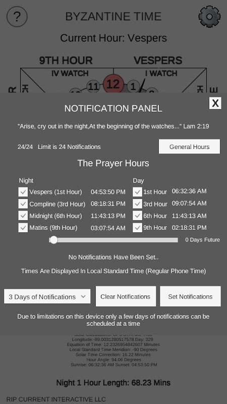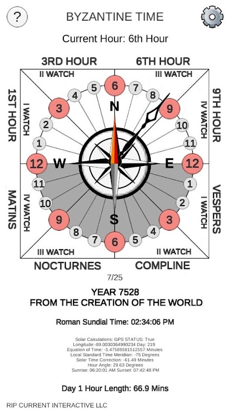 Byzantine Time originates even before the Byzantine Empire found among Ancient Judeans. It uses Unequal Hours like a Sundial. The next day begins at Evening rather than midnight on modern clocks. This Application Requires GPS to operate , how ever you can manually type in the Longitude and Latitude in the settings.