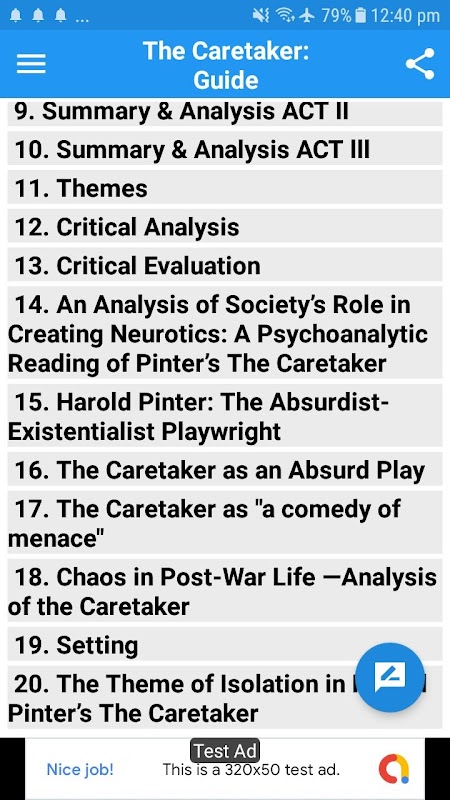 This Guide app works both online and offline, and contains 20 basic topics about one of the famous plays of Harold Pinter, The Caretaker.