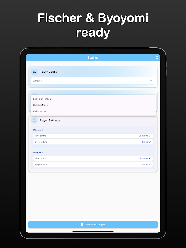 Customize different time settings for each player to create a balanced or challenging match using any of the above formats.