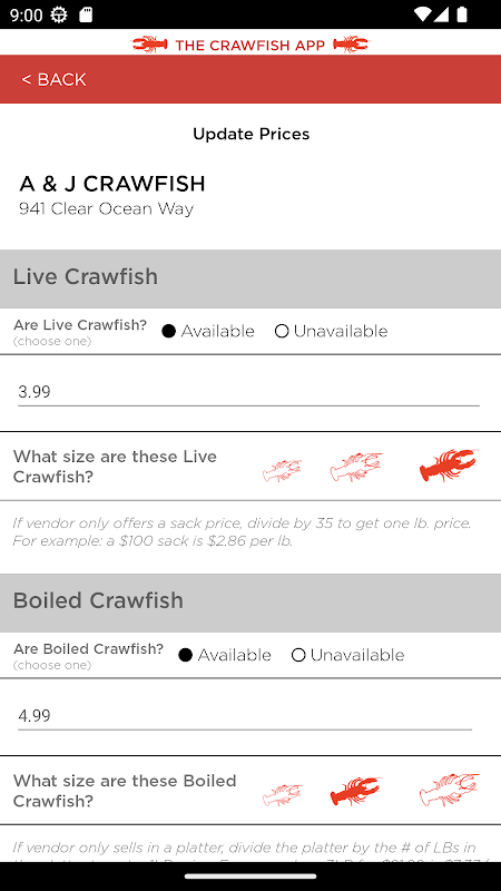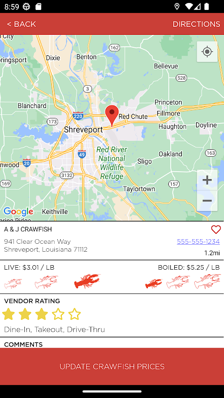 The Crawfish App uses either your device's location or an entered address to list crawfish vendors in the area. You have the ability to view by price, reviews, or distance. Submit your own vendors if you do not see any in your area or write reviews about the ones you do see. After signing up for an account in the app you can save your favorite vendors and update vendor prices! We work hard to keep prices updated by signing vendors up for accounts so they can keep their prices up-to-date and by calling vendors on a regular basis but now users can update vendor prices so we stay as accurate as possible