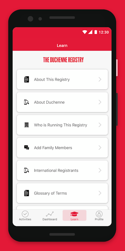 To better understand your health and your daily experience living with Duchenne/Becker, we will ask you to respond to several surveys. If you are a previous Duchenne Registry participant, your most recent survey data will pre-populate when you download the new app. We will also ask you to share a copy of your genetic test report. You can decide how much information you wish to share. However, the more data we have, the more we can share with researchers and the better we can tailor information to your specific needs.