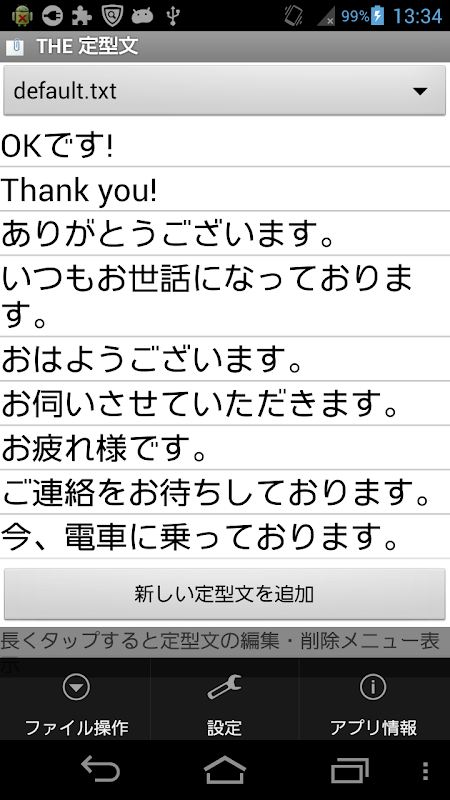 Because fixed phrase file is text type, you can create and edit with text editor or PC etc.