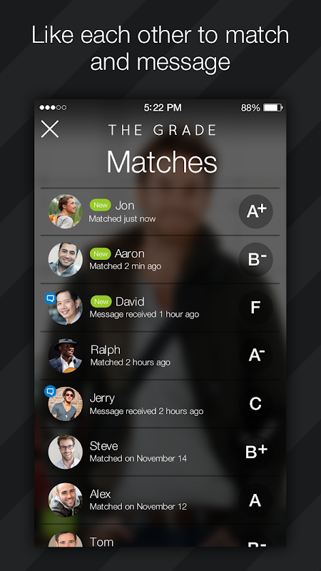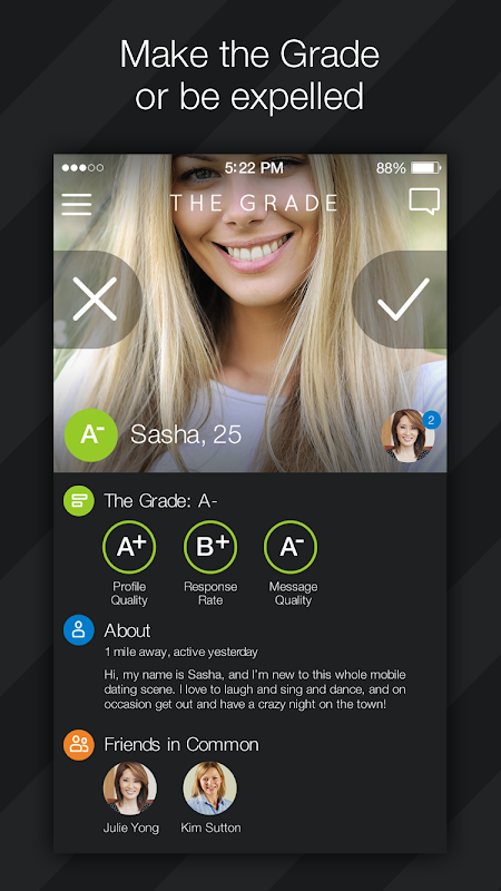 We hold you accountable for your behavior. Our algorithm analyzes each user and assigns them a letter grade, ranging from A+ to F, based on profile, messaging and peer review. Our Details page offers tips on how to improve your grade. Those who fail to raise their overall grade above an F are expelled from the app.