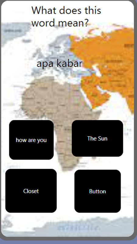 The app will present the viewer with questions of what the words mean in indonesia and if they get it wrong it will present the viewer a incorrect slide and if they get it right it will present a slide showing that the viewer got it right.