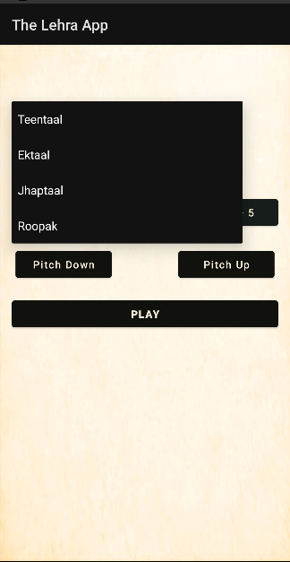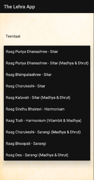 This is a free lehra app that contains lehras for Teentaal, Ektaal, Jhaptaal and Roopak taal of instruments like Sitar, Harmonium and Sarangi.