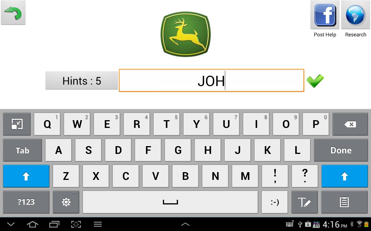 Getting stuck ? No problem there is a hints button and you can build up hints by guessing more logos and you can also post a logo to Facebook for help.