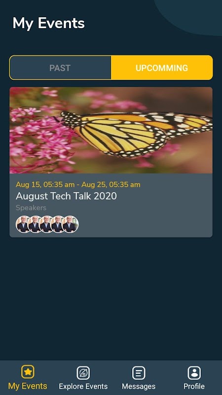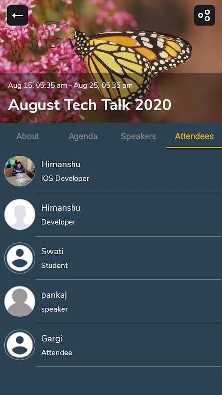 Speakers: Speakers are the users who will be added to any event created by organizer. Speaker will get email invitation whenever he will be added to any event's topic. He will join this application to check all the events where he is added as speaker. He further start the video conferencing as a presenter where there will be all the attendees who joined this event.