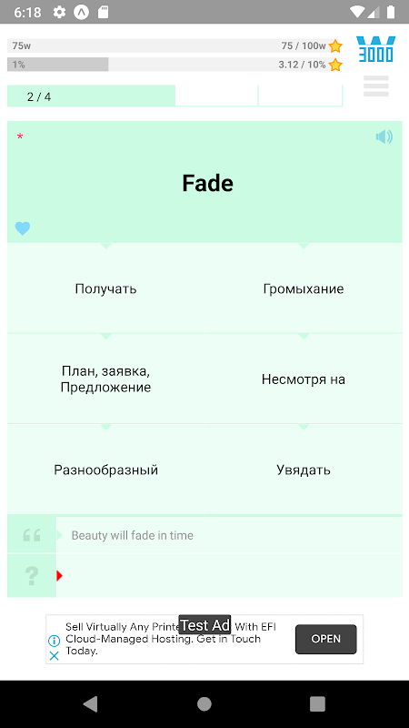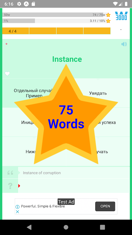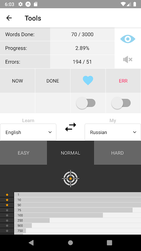 Add a word to favorites or activate an Error words mode as well as Favorites words mode. A lightweight app without any cost and permissions!