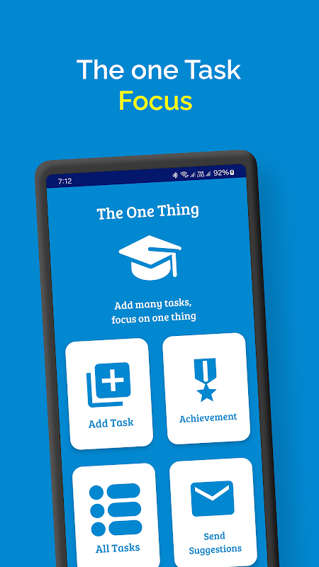The One Thing Task App helps you stay focused by prioritizing one task at a time. Eliminate distractions and improve productivity by simplifying your to-do list. Perfect for goal-oriented individuals who want to achieve more with clarity and less overwhelm. Plan, execute, and succeed—one task at a time. Start simplifying your workflow today with The One Thing Task App!