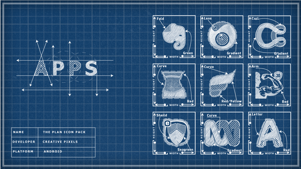 Reveal the basic structure of app Icons with The Plan a fine line Icon Pack.