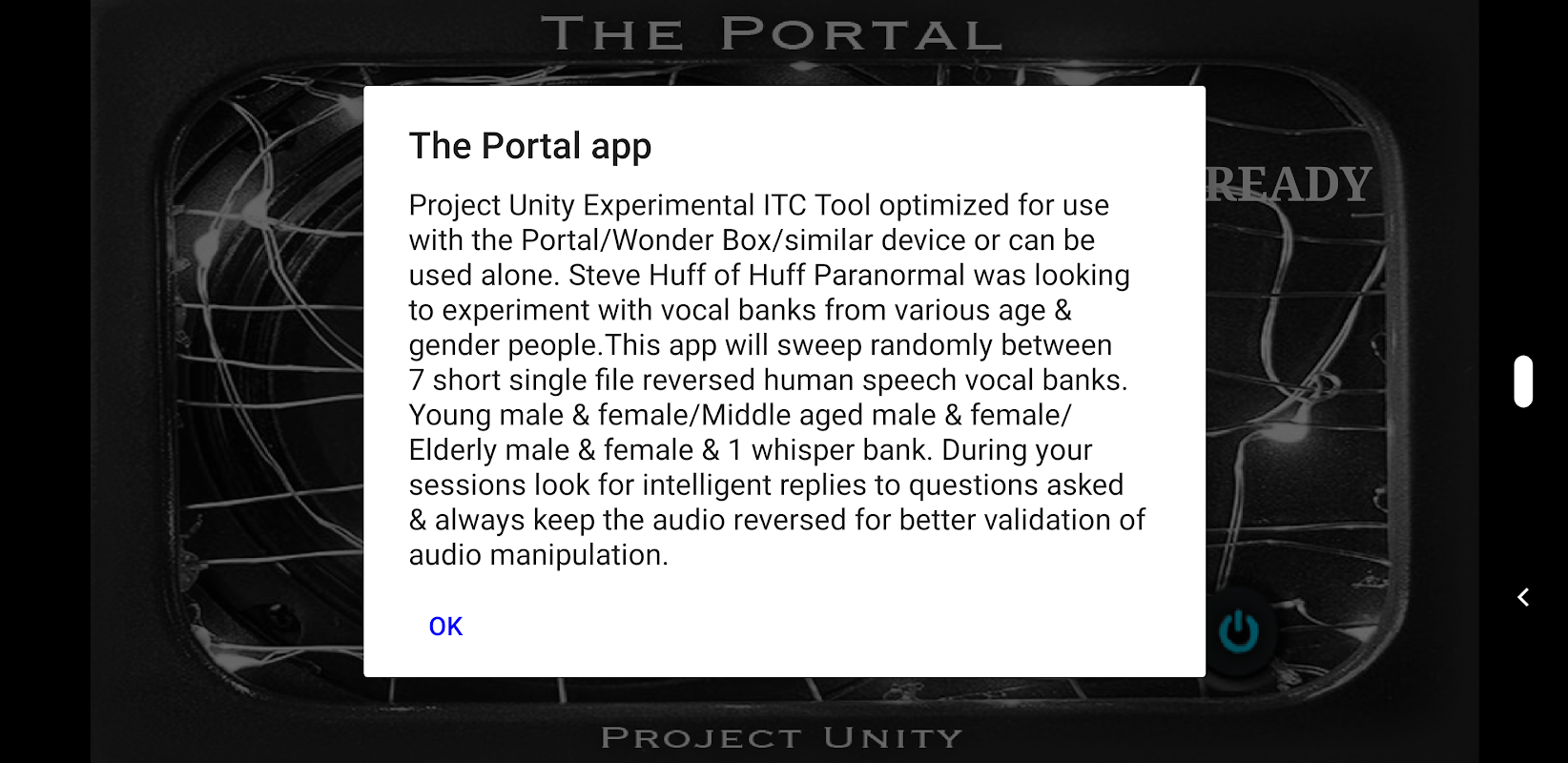 Steve Huff of Huff Paranormal was looking to experiment with vocal banks from various age & gender people. This app will sweep randomly between 7 short single file reversed human speech vocal banks. Young male & female/Middle aged male & female/Elderly male & female & 1 whisper bank. During your sessions look for intelligent replies to questions asked & always keep the audio reversed for better validation of audio manipulation.