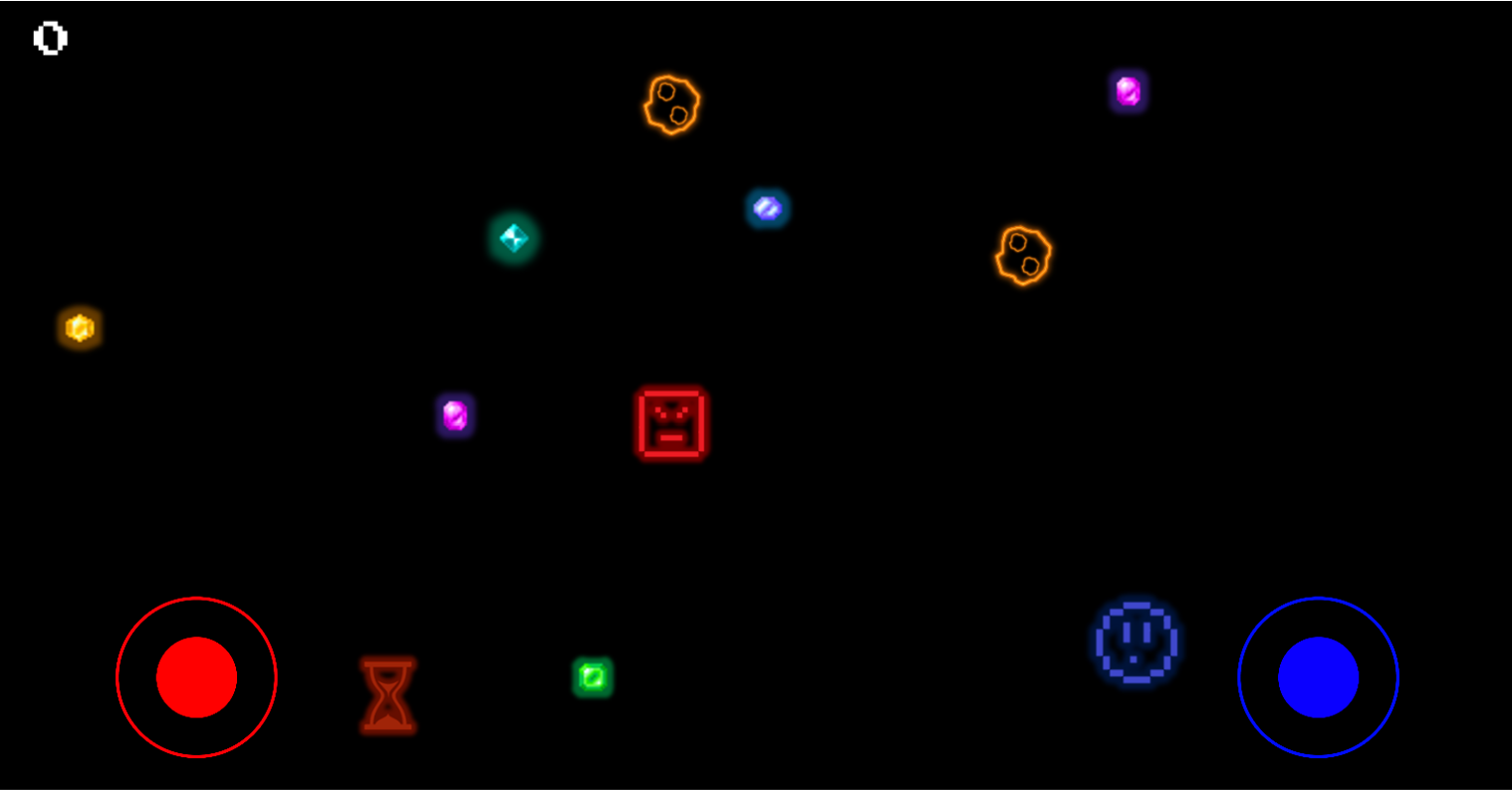 - Red player destroys rocks to release gems and powerups. Blue player collects gems and powerups.