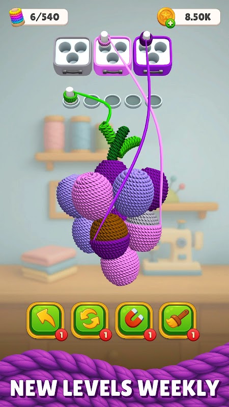 - Tap to collect threads from knitted objects and match them with the same-colored boxes at the top