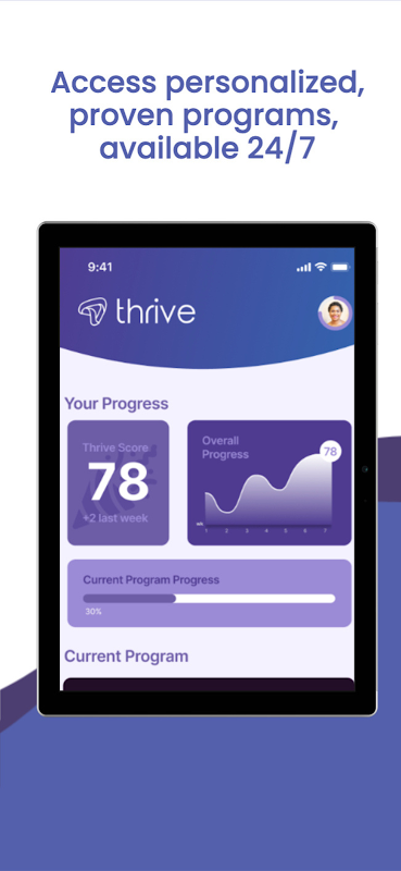 With Thrive, you have a professional guide in your pocket, available to you anytime, anywhere. No more waiting for appointments or speaking with strangers. You can now receive personalized support and guidance within the comfort and privacy of your own space. Thrive360 recreates and enhances the in-office experience with specialists in different areas, so you can get trusted support immediately.