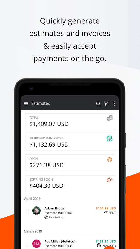 • Easily issue estimates and invoices on the go and get paid faster than ever before