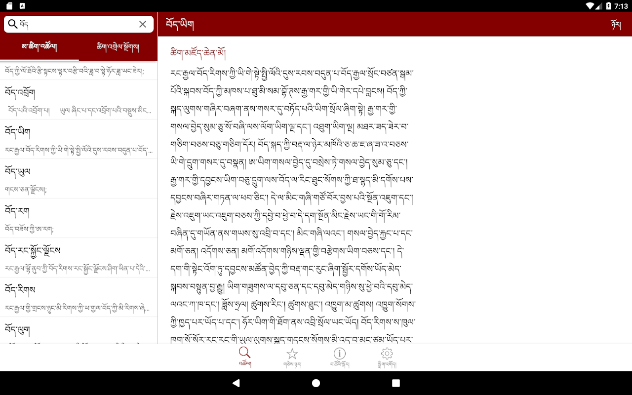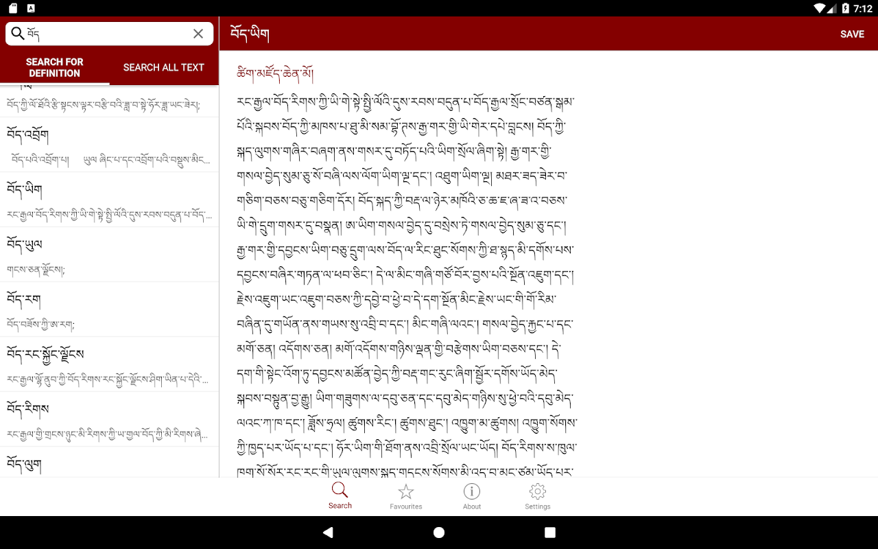 Note: a tibetan keyboard is required to be installed in order to search in tibetan. One is included in Android 7 and above; otherwise a third-party app will be required, such as Tibetan Keyboard by Iron Rabbit: https://play.google.com/store/apps/details?id=org.ironrabbit.bhoboard&hl=en