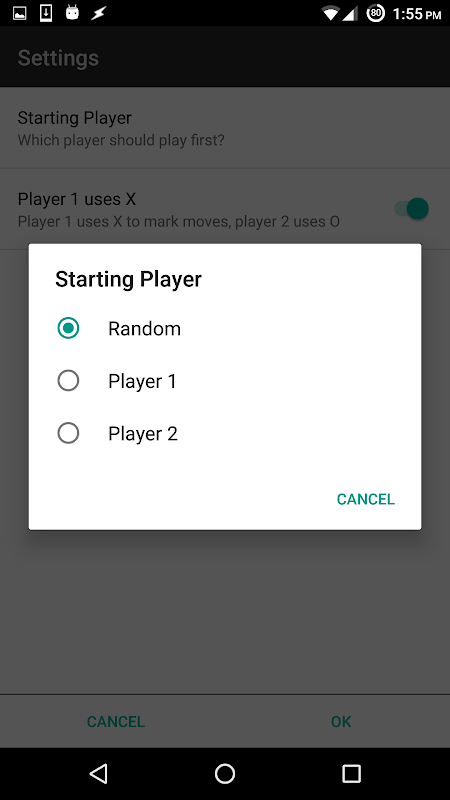 By default, player 1 places a red X and player 2 uses a blue O. In 1-player games, the human player is player 1 (X) and the computer is player 2 (O). The color of the X and O can be changed in the settings, as well as which symbol each player uses.