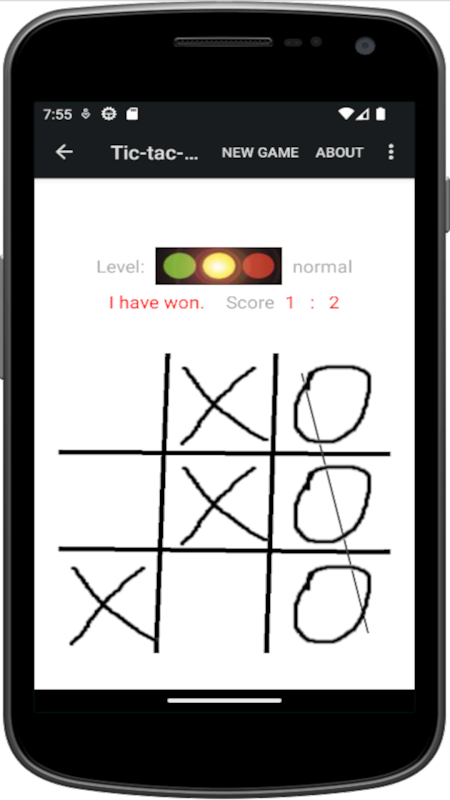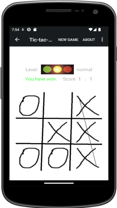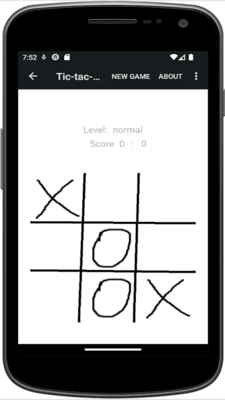 The player (X) plays against the Android App (O). The two players place their mark alternately on a 3 x 3 squares wide playing field. Who sets the first three of his characters in a row, column or main diagonal is the winner.