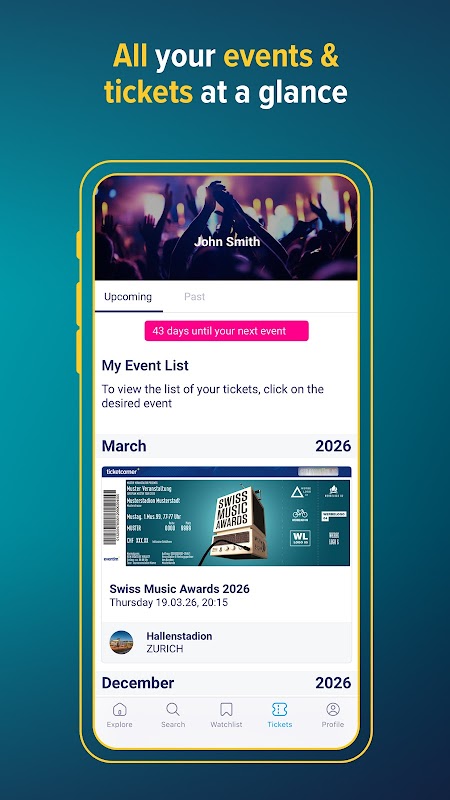 The Ticketcorner app provides you with all the most important information to do with your ticket purchase, whether it's ticket sale release dates, tour announcements or extra concerts.