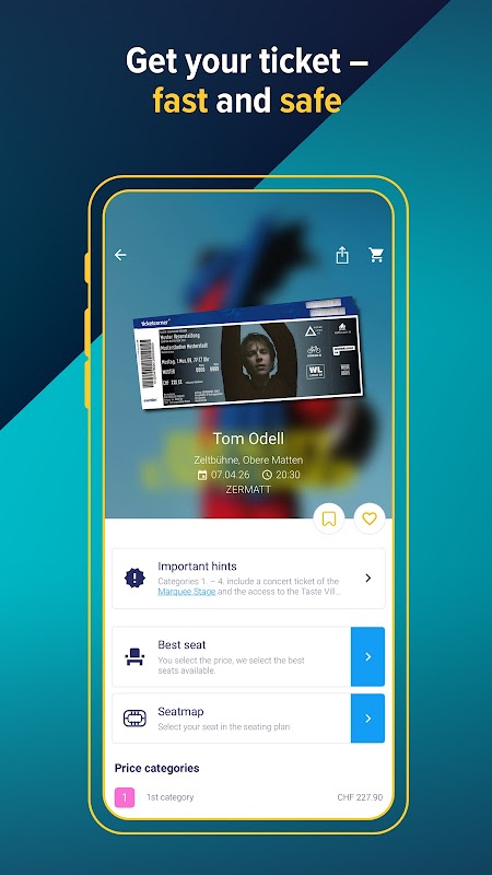 • Secure account management: Your Ticketcorner login gives you access to your mobile tickets, orders placed and ticket alarms. To the highest security standards, of course.