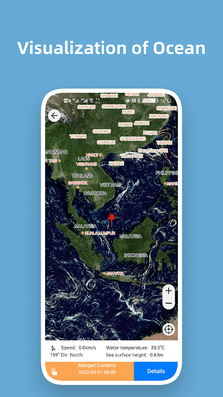 3.Merged Ocean-Currents approach a practical velocity at sea surface. The total current is obtained from the simple addition of contributions from the oceanic general circulation,waves (e.g. Stokes drift) and tides(the exchange between the coast and the open sea). Support access to the speed and direction of Merged Ocean-Currents, the speed and direction of oceanic general circulation,sea surface height and sea surface temperature.