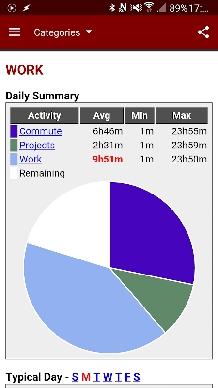 ★ A graphical summary shows how your time is being allocated, including average, minimum and maximum daily duration for each activity, and total time spent in the last week, month and year (by category and activity).
