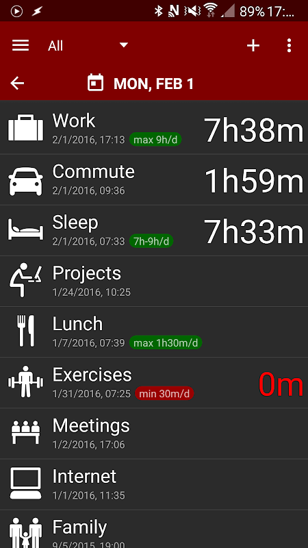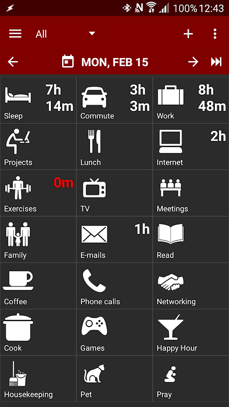 Time Balance is a personal-oriented time tracker that can help you to make a better use of your day by controlling the duration of common activities like exercises, study, work, commutes, sleep, time with family etc.