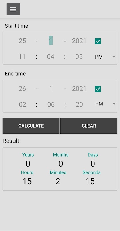 👉 Time Calculator app makes calculations of time simple and fast. You can get duration in years, months, days, hours, minutes, and seconds between two datetimes.