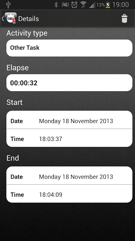 - At the beginning of the work day, click the ON/OFF button. This action activates a chronometer on the "Other Task" activity, and you are alerted according to the parameter setting which you entered.