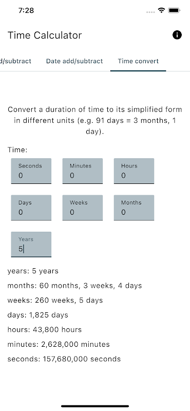 4. convert a duration to different time scales (e.g. 5 years is 60 months, 3 weeks, 4 days)
