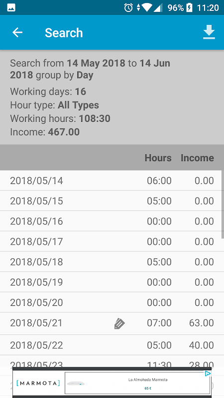 • Add and edit the hours that you have spent each day. You can also use different hour and price types, therefore calculating the money earned in a simple way.