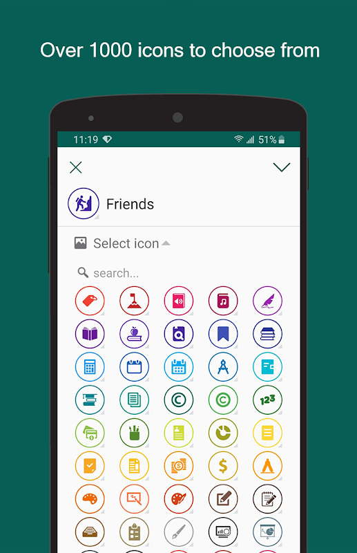 To set up a new activity icon, you'll click on the + icon. In the new screen, you can add a name and set an icon for that activity. There are over 1000 icons to choose from, you can search through icons using keywords. By long pressing an icon you'll be able to choose a color for your icon.