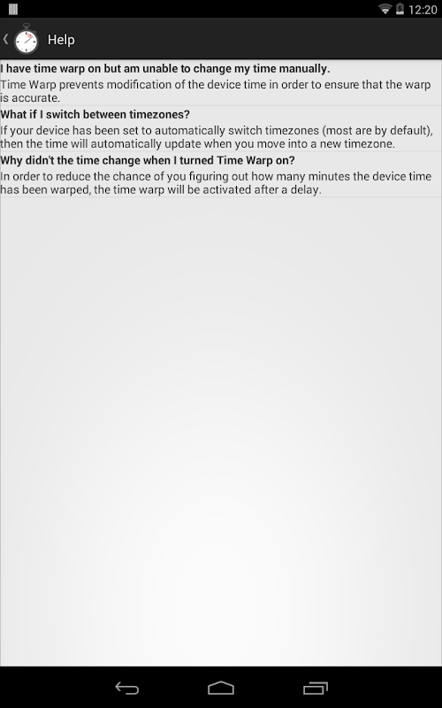 NOTE: You must turn Time Warp off before you uninstall it in order to correct the device time. If you accidentally uninstall it before turning it off, just reinstall the app and turn it on and then off again.