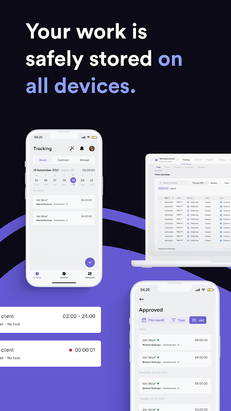 Do you dread having to hand in your worked hours at the end of the month? Feel like you’re missing out on productivity that others seemingly master? Start tracking time with TimeChimp -- Easy does it.TimeChimp has got you covered across a multitude of devices and various solutions. Start a timer in your browser, and submit the entry for approval using your mobile phone. All your entries are safely stored and accessible everywhere.