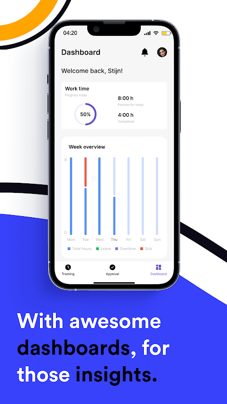 - Dashboard: Gain insight into your worked hours, time off, overtime, sick hours, and more.
