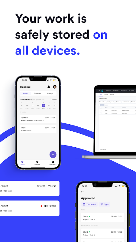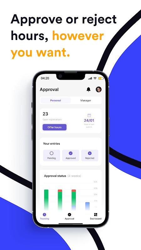 - Approval: Submit your hours for approval and see which hours are pending, approved or rejected.