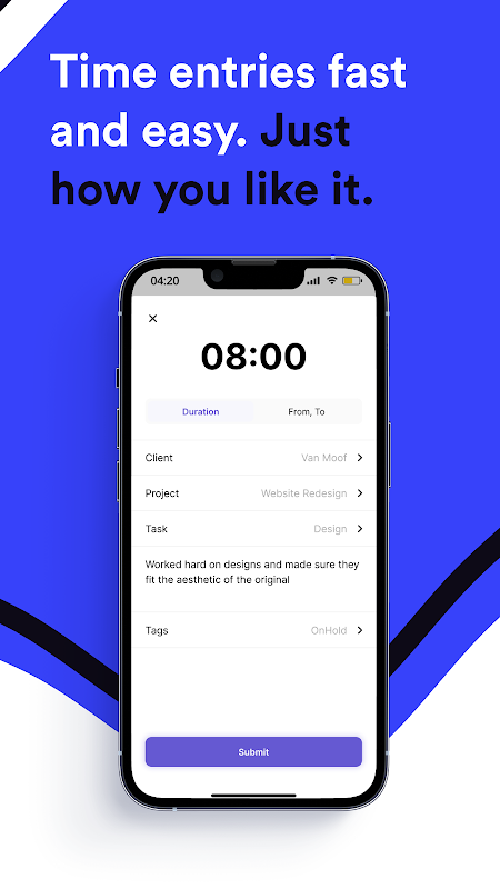 - Timer: Tap to start the timer and get to work. Don’t worry about details; just quickly add a customer, project or activity later.