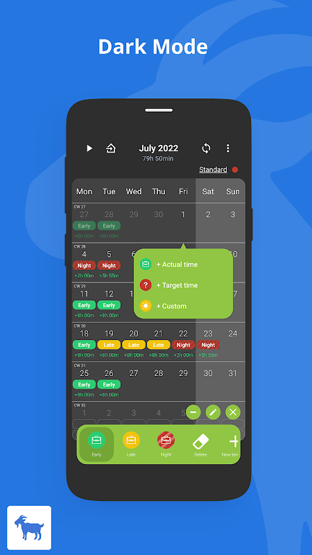 The timeGoat app lets you plan your working hours and your shift work quickly and clearly and provides you with an overview of your time trackings at the same time. Equipped with easy-to-understand functions and a beautiful, clear design, the app makes your entire weekly and monthly planning easier.
