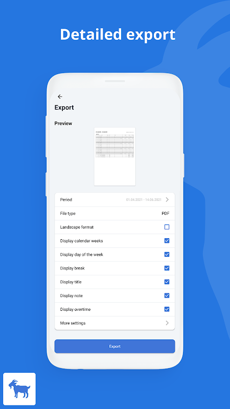 timeGoat enables you to download your calendar as a PDF, making it easier for you not only to plan your weeks and months, but also to review them. You will receive a clear time sheet, which you can also print out or send. This also includes actual / target times including overtime hours and your own signature. - PRO feature