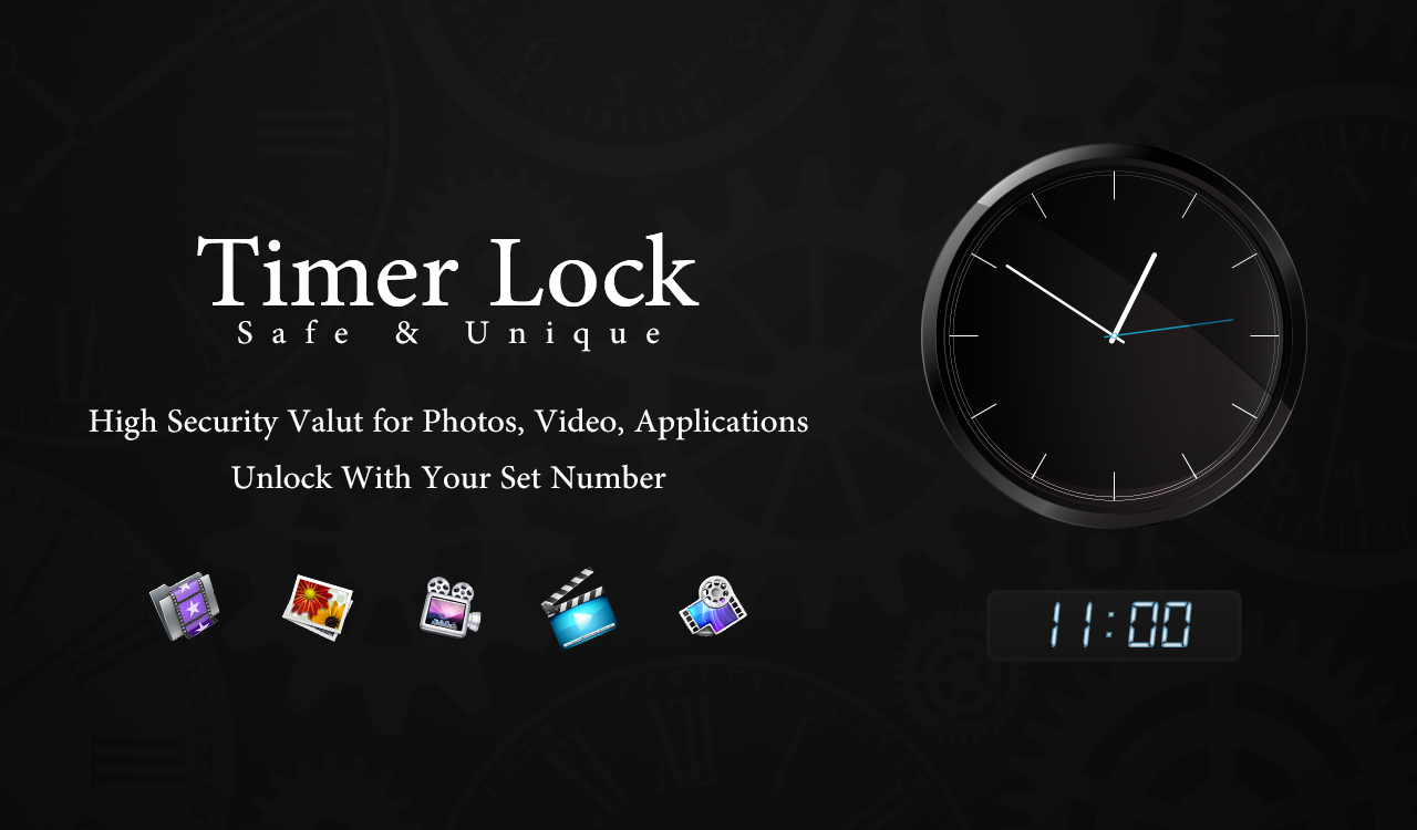 Timer lock: secret gallery. A high-security vault for photos and videos hidden in a clock With the new Time Lock-Clock Vault app, it is not only a timeless clock with an alarm function, but also a high security vault for your personal photos and videos.