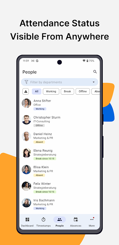Who is currently working on which task, absent, or working remotely or from the office today? In the status overview, you can see live working time and employees' absences. It is especially interesting for managers and facilitates time management for teams.