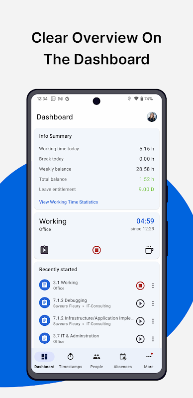 Work hours tracker records time live or subsequently. When you clock in and out, pause or stop the working hours tracking in the app, timestamps are automatically saved in your timesheet, providing a work log overview. In Project Time Tracking, employees can book time for separate tasks, projects or customers.
