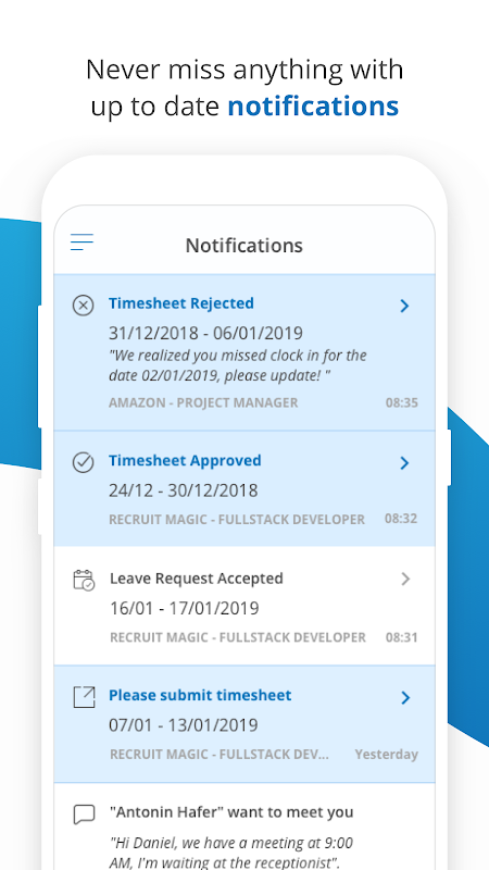 - Get instant notifications for your approved / rejected timesheets, including timesheet submission reminders.