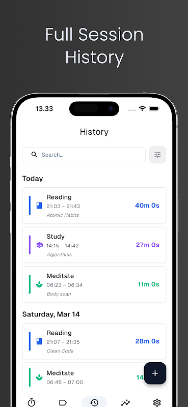 • Search, filter, and edit your full session history