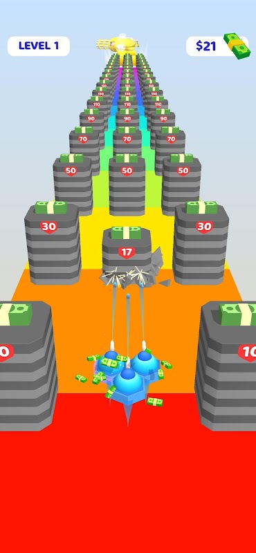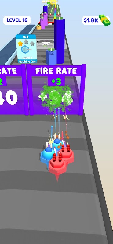 Grind weapon cards to get better weapon from them! You will use those cards to place and build your own army! Use power up gates to advance your weapons! At the end of the level, reach to the furthest point!