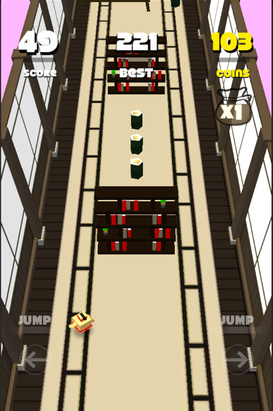 Eat sushi to earn points while dodging deadly SPIKES and vaulting over deadly SHRUBS.