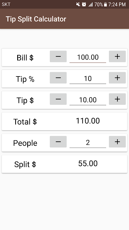 Simple tip and split calculator.Use it when you pay tip or split paying.