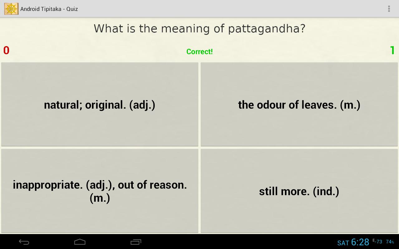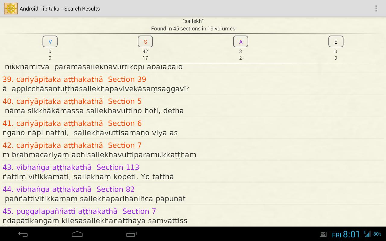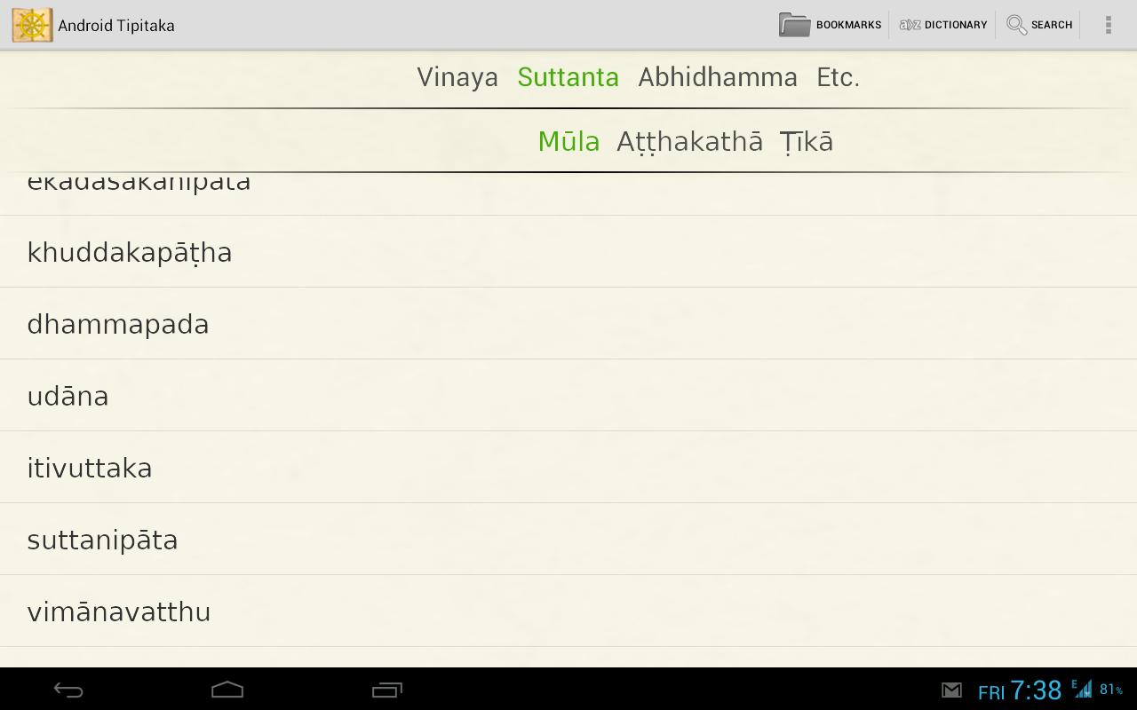Tipitaka for Android is an app for reading the Theravada Buddhist Pali Tipitaka, commentaries and sub-commentaries in Pali. It is suitable for advanced students of the Pali language, as it does not include English translations. It does have several Pali-English dictionaries.