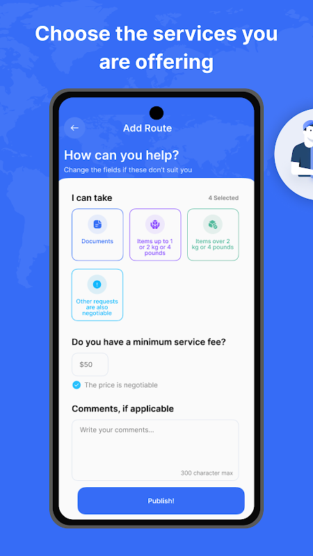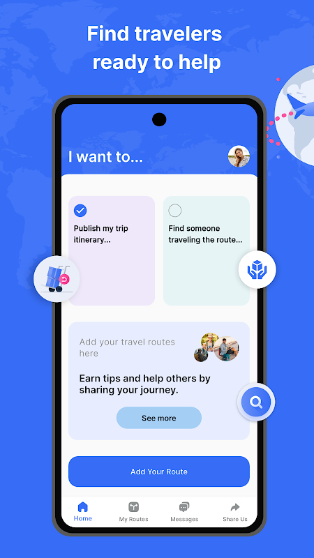 Share your routes in a few taps and start earning money by helping others during your travels. Connect with people who need assistance and get rewarded for your efforts. Whether it’s delivering documents, carrying packages, or handling personal requests, you can lend a hand while traveling.