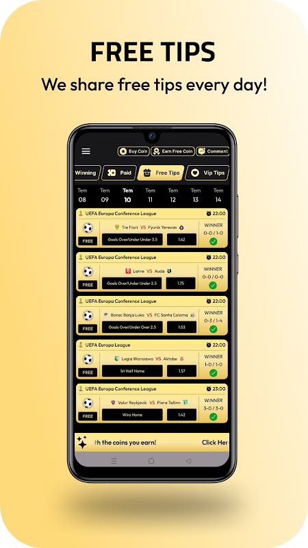 The Betting Tips featured in the app are presented as a result of statistical evaluations. Each suggestion is based on recent form, previous performances, and key match data, helping users gain a broader understanding of upcoming football fixtures.